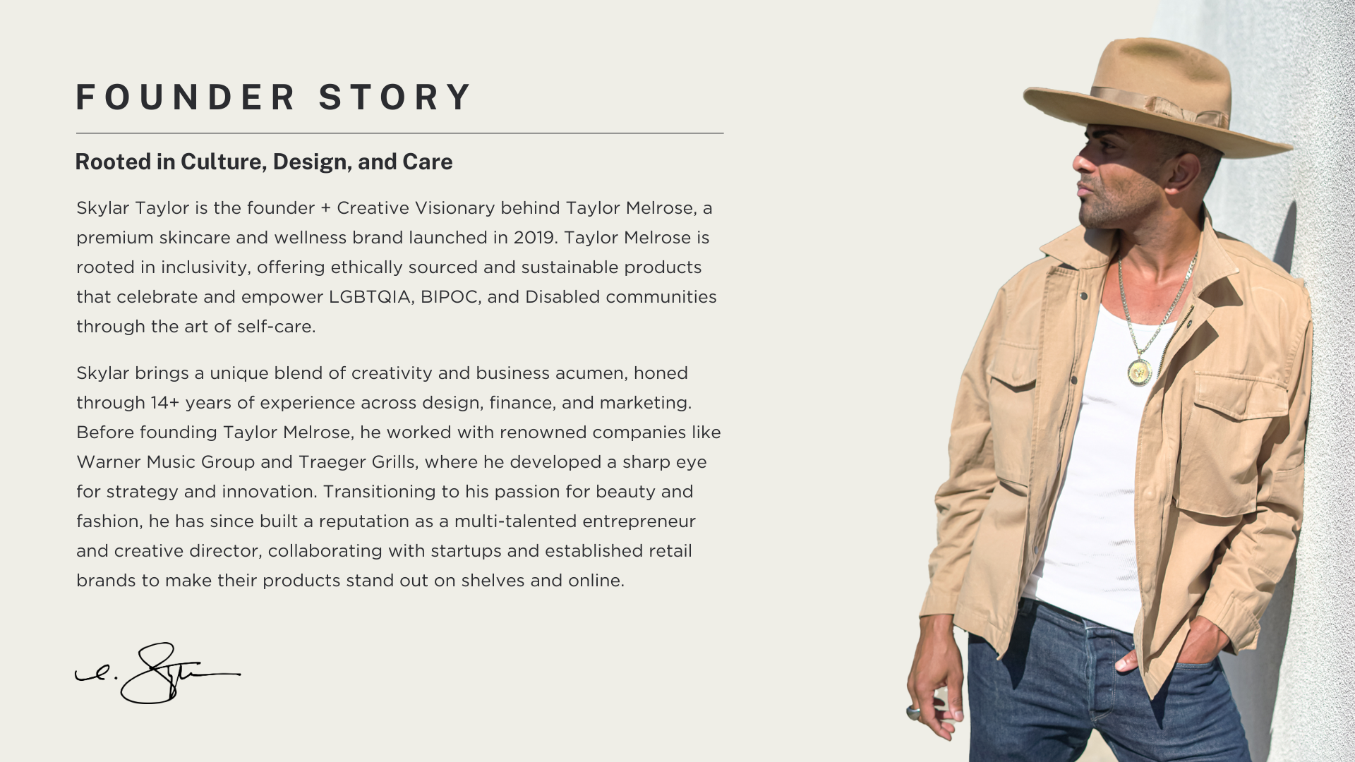 In November 2019, our founder launched Taylor Melrose from a home office, driven by a need for skincare that celebrates melanin-rich skin and need to have his creative designs seen by others and not be hindered by an all white decision maker at this corporate career. In an effort to remove the barriers that stood between him and the retail buyers he set out to design a line. On November 14, 2021, with his families help they sold as vendors setting up a pop-up at a local Hollywood farmer’s market.